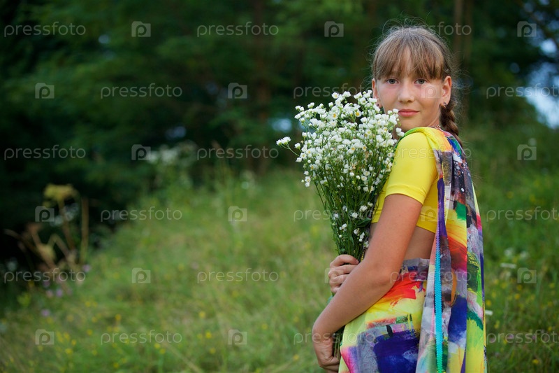 Девушка европейской внешности в традиционном индийском сари с букетом белых цветов на поляне
