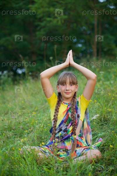 Маленькая девочка в красочном сари сидит на цветочном лугу в асане йоги