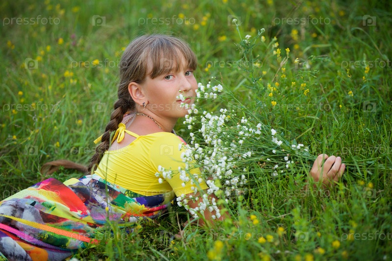 Девушка европейской внешности в традиционном индийском сари лежит на траве на поляне