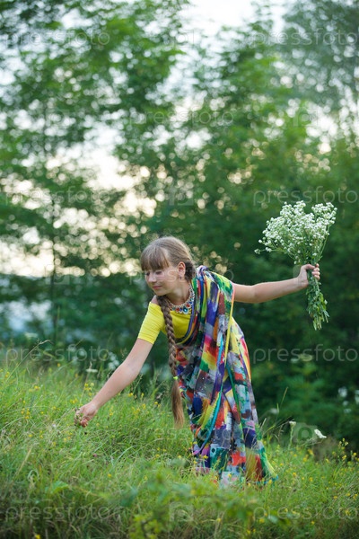 Девушка европейской внешности в традиционном индийском сари собирает букет цветов на поляне
