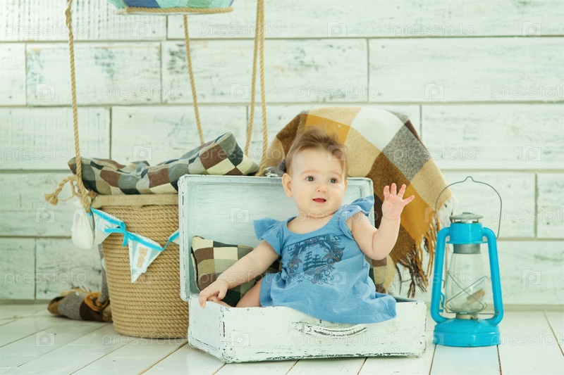 Маленькая новорожденная девочка в голубом платье сидит в чемодане. Концепция детства и материнства, путешествия с детьми