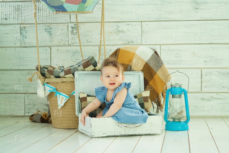 Маленькая новорожденная девочка в голубом платье сидит в чемодане. Концепция детства и материнства, путешествия с детьми