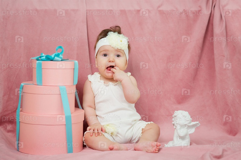 Маленькая девочка сидит на розовом фоне в белой одежде