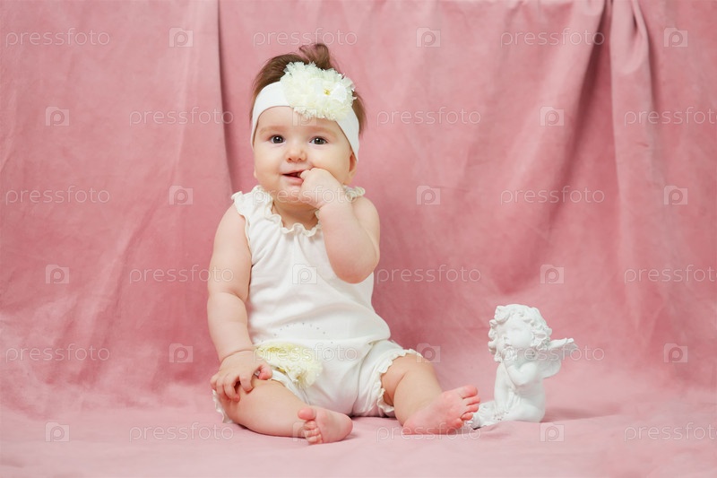 Маленькая девочка сидит на розовом фоне в белой одежде