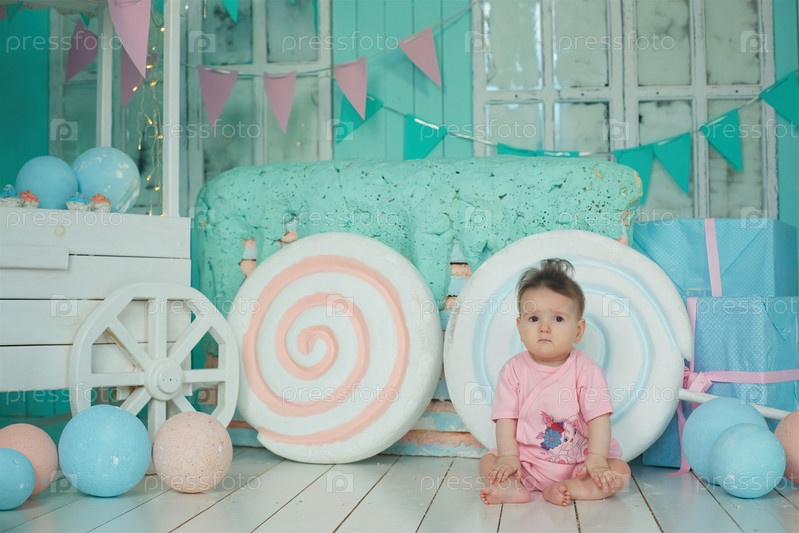 Младенец лежит на мягкой поверхности в светлой комнате, одетый в розовую одежду. Концепция детства