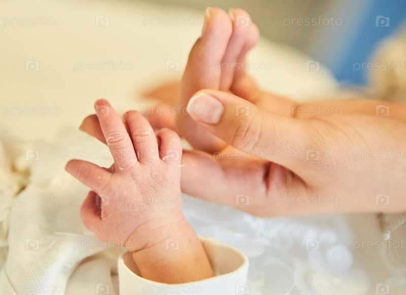 Маленькие ручки новорожденного в руках матери. Понятие материнства и детства