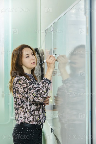 Учительница пишет на доске задание на урок