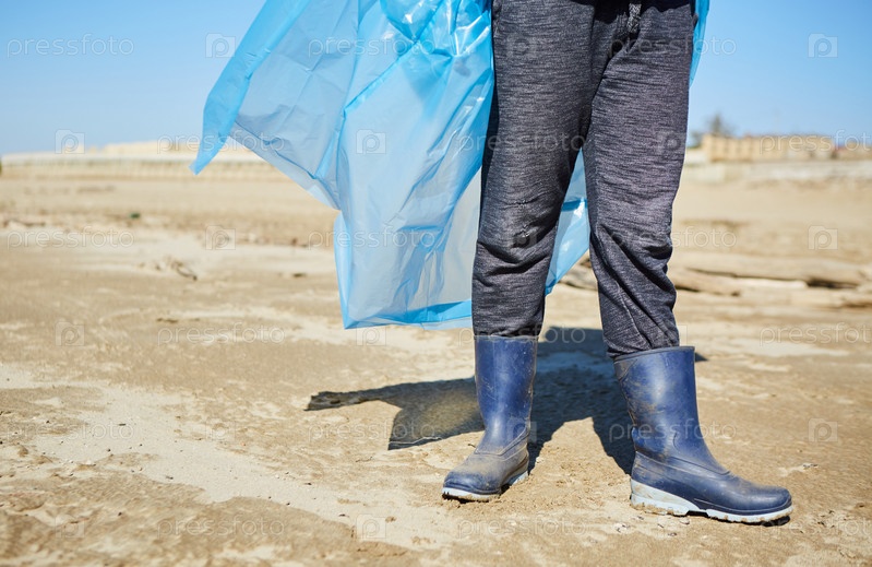 Ноги мальчика в грязных резиновых сапогах и пластиковом плаще