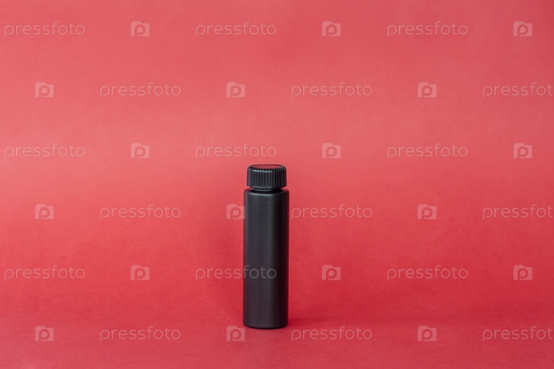 Черная бутылка со сливками на красном фоне. Уход за кожей, увлажняющий и питательный или солнцезащитный крем