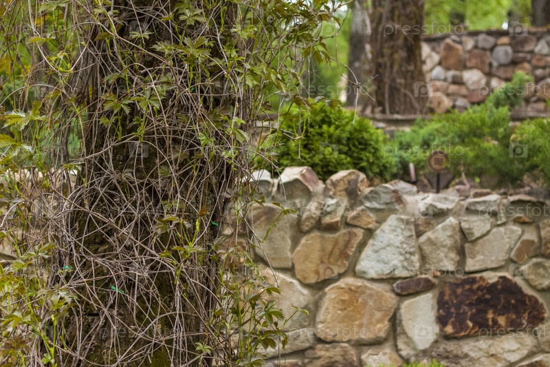 Большое дерево в парке обвито вьющимся растением. Красивый зеленый фон