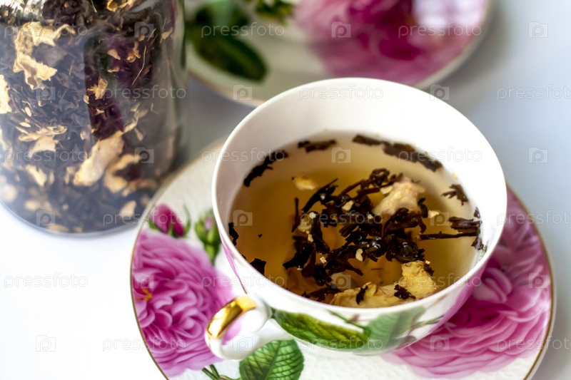 Чашка чая. Большие листья чая в чашке. Банка чая. Крупнолистовой чай с фруктами