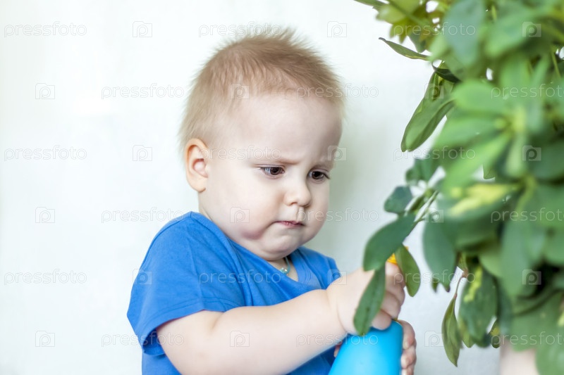 Ребенок помогает ухаживать за комнатными растениями. Мальчик распыляет на листья из пулемета. Уход за растениями