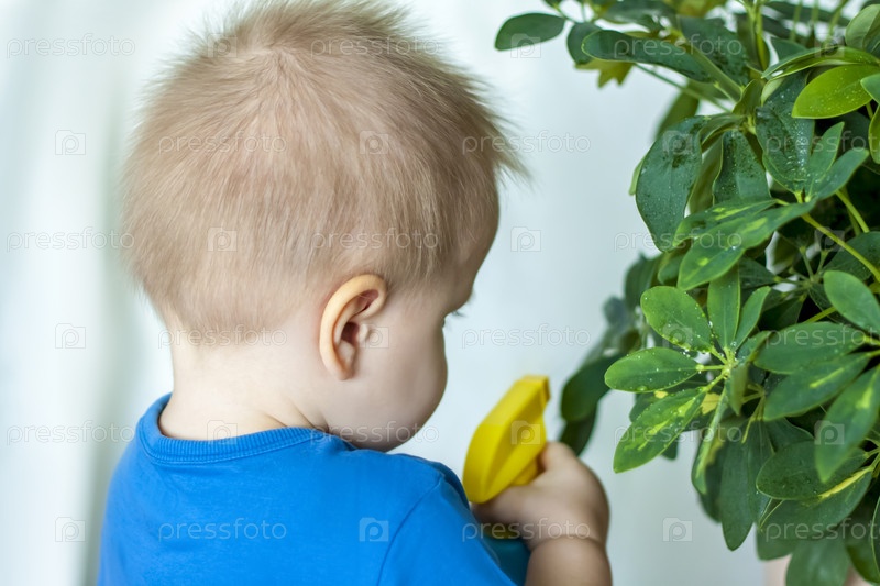 Ребенок помогает ухаживать за комнатными растениями. Мальчик распыляет на листья из пулемета. Уход за растениями