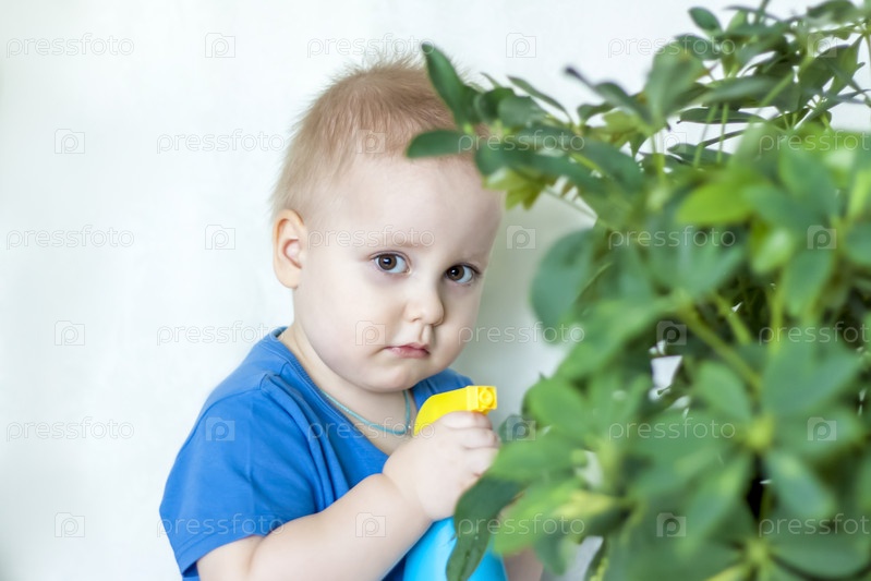 Ребенок помогает ухаживать за комнатными растениями. Мальчик распыляет на листья из пулемета. Уход за растениями
