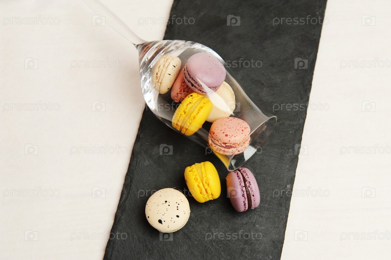Красочные сладкие французские мини-макароны, посыпанные перевернутым бокалом на грифельной доске. Белый фон