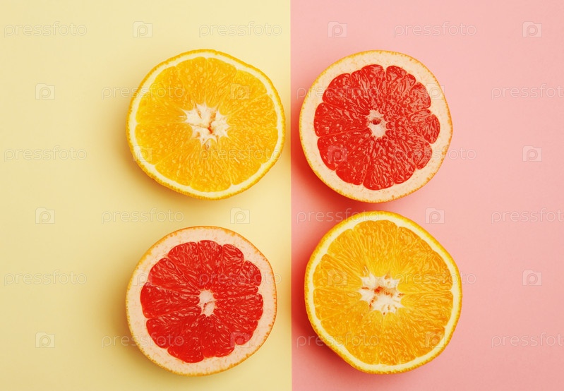Половинки апельсина и грейпфрута на геометрическом двухцветном мягком желтом и розовом фоне