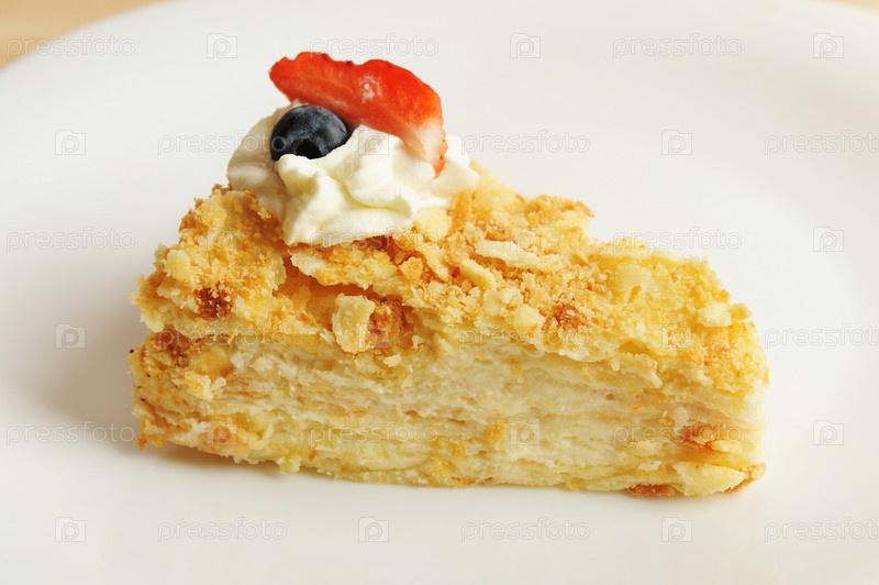 Кусок классического торта Наполеон, украшенный кремом и ягодами на белой тарелке, крупным планом