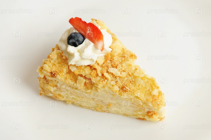 Кусок классического торта Наполеон, украшенный кремом и ягодами на белой тарелке, крупным планом