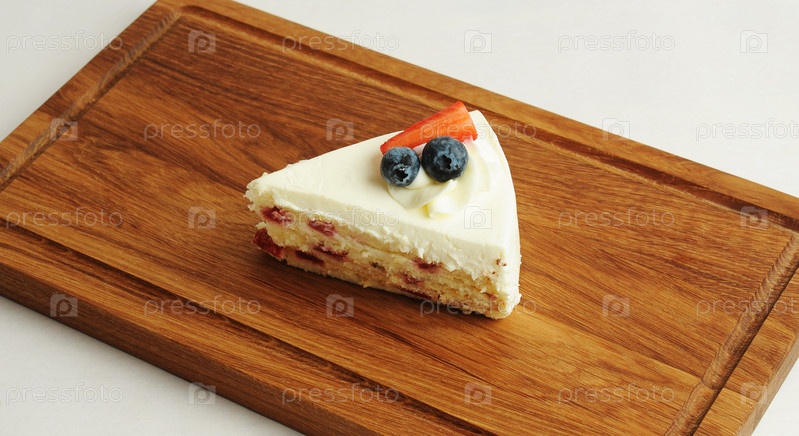 Кусок молочного пирога на деревянной доске. Бисквитные коржи, сливочный крем, ягодный джем, сырная глазурь. Украшен свежими ягодами