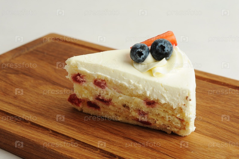 Кусок молочного пирога на деревянной доске. Бисквитные коржи, сливочный крем, ягодный джем, сырная глазурь. Украшен свежими ягодами