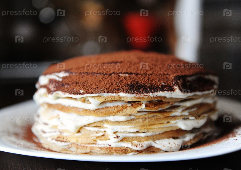 Блинный торт с начинкой тирамису, посыпанный какао-порошком. Белая тарелка, фон кофейни. Вид сбоку, крупный план