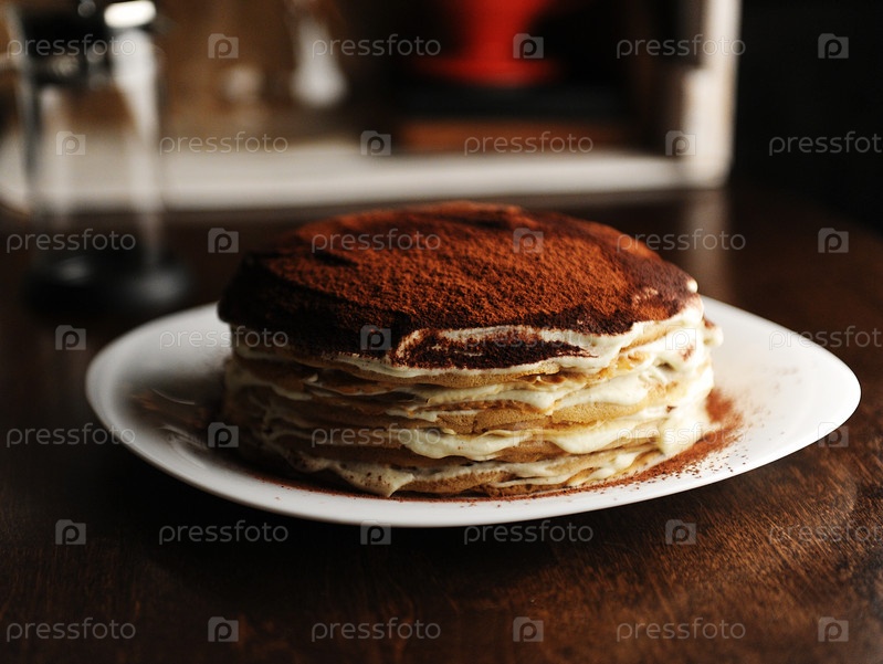 Блинный торт с начинкой тирамису, посыпанный какао-порошком. Белая тарелка, фон кофейни. Вид сбоку
