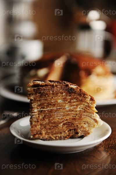 На тарелке подается кусок блинного торта с начинкой тирамису и какао-порошком. Интерьер кофейни
