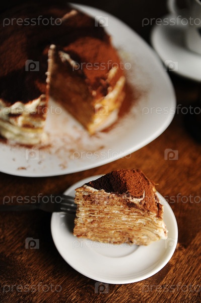 На тарелке подается кусок блинного торта с начинкой тирамису и какао-порошком. Интерьер кофейни