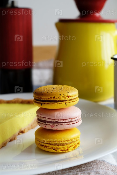 Желтые и розовые миндальные печенья укладываются на белую тарелку в кофейном натюрморте