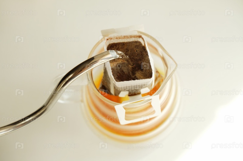Процесс заваривания кофе в капельном мешке, вид сверху. Легкий простой метод заваривания, новая тенденция
