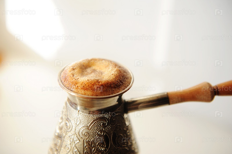 Заваривание турецкого кофе в медной турке. Высоко поднимающаяся пена крупным планом. белый фон