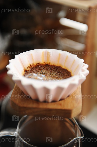 Цветущий кофе в розовой керамической капельнице оригами. На деревянной подставке для кофе. Закрыть. Альтернативное ручное заваривание