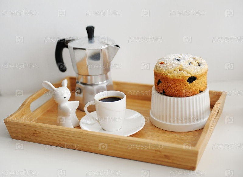 Кофе и кекс подаются в деревянном бамбуковом подносе. Кофеварка мока горшок, белая посуда