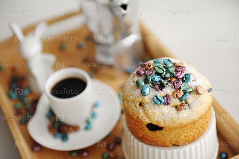Пасхальный кулич, посыпанный цветными жемчужными кофейными зернами, крупным планом. Эспрессо чайник мока и чашка кофе на заднем плане