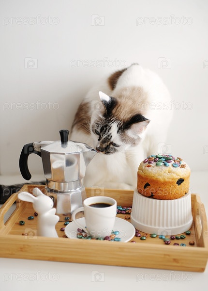 Милый кот и пасхальный натюрморт. Кофе и торт. Кофеварка для эспрессо. Белая посуда, керамический пасхальный кролик