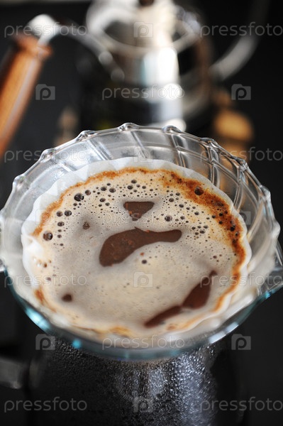 Прозрачная стеклянная капельница v60 с бумажным фильтром, вид сверху. чайник на гусиной шее