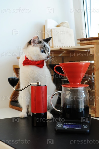 Красивая белая голубоглазая кошка-бариста в галстуке-бабочке готовит кофе. красная капельница v60 и ручная кофеварка