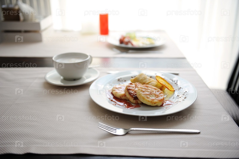 Подали завтрак в ресторане. Сырники с апельсиновыми колечками и кофе