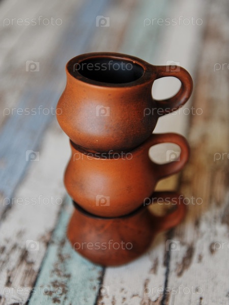 Три глиняные керамические чашки, поставленные друг на друга. Керамика ручной работы. Деревянный фон