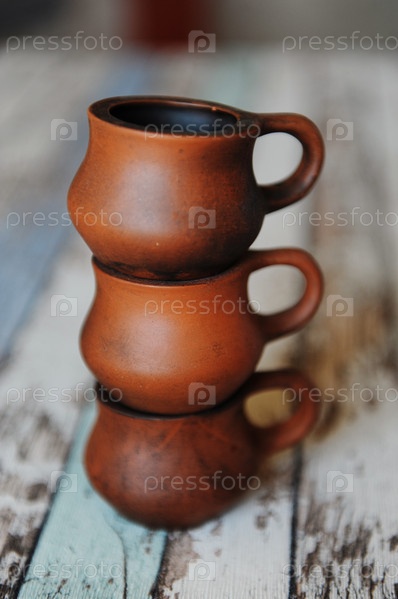 Три глиняные керамические чашки, поставленные друг на друга. Керамика ручной работы. Деревянный фон