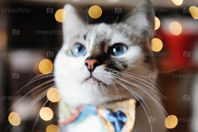 Красивый портрет белого голубоглазого пушистого кота в галстуке-бабочке. Фон размытых волшебных огней. Новогоднее настроение