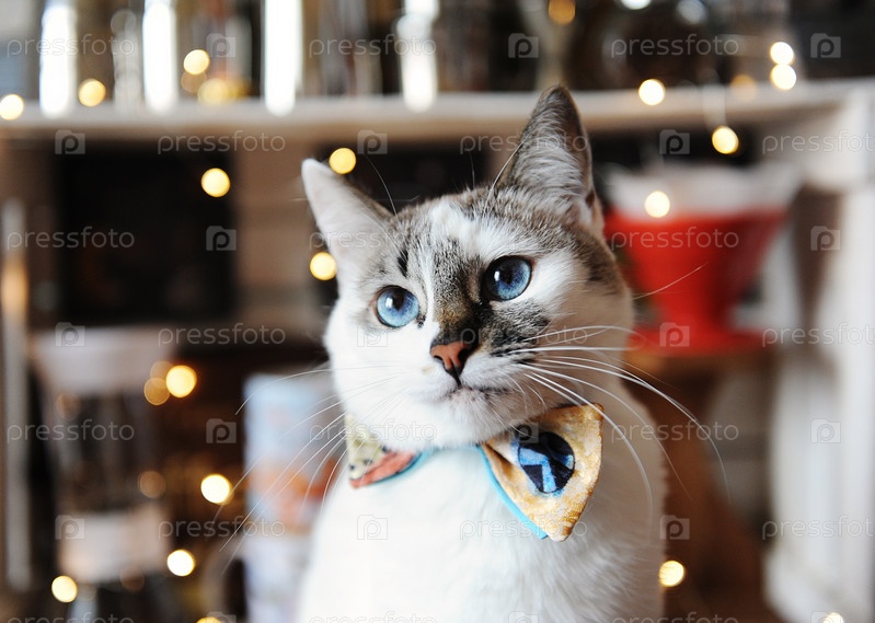 Красивый портрет белого голубоглазого пушистого кота в галстуке-бабочке. Фон размытых волшебных огней. Новогоднее настроение