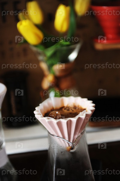 Альтернативное заваривание кофе в розовой керамической капельнице с бумажным фильтром. Желтые цветы тюльпаны на заднем плане