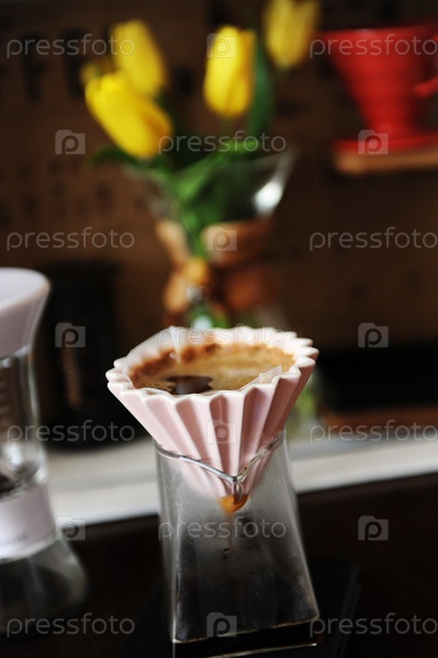 Альтернативное заваривание кофе в розовой керамической капельнице с бумажным фильтром. Желтые цветы тюльпаны на заднем плане