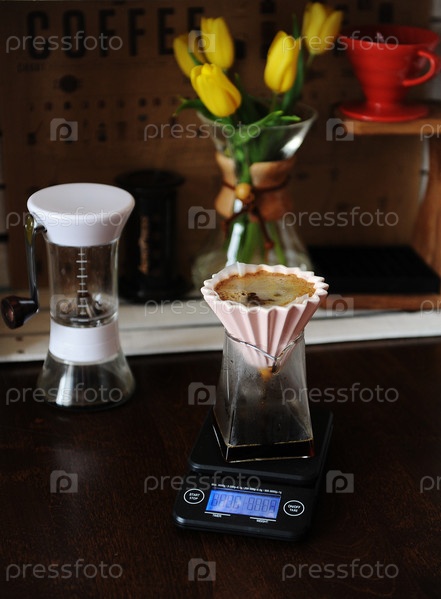 Альтернативное заваривание кофе. Розовая керамическая капельница с бумажным фильтром. Электронные весы. Желтые тюльпаны на заднем плане