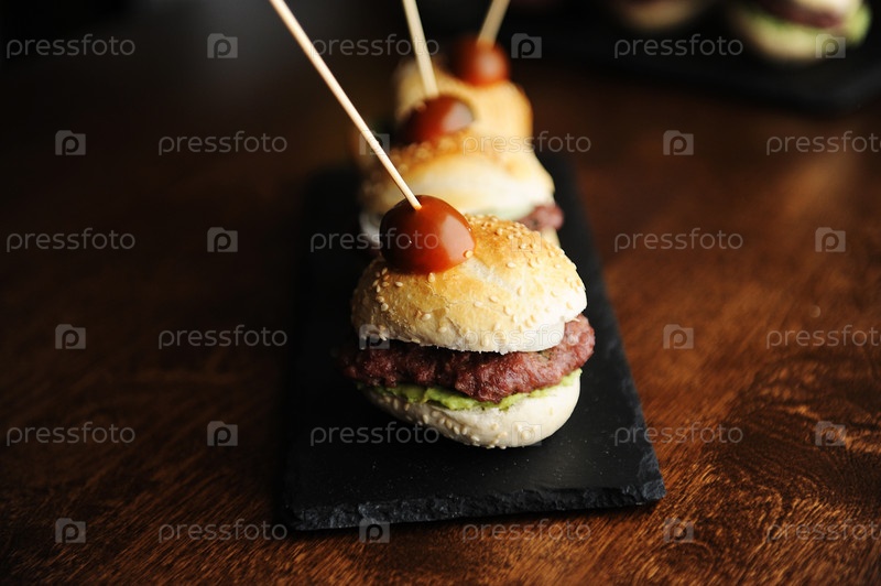 Мини-бургеры с говядиной на черных грифельных досках. Кунжутные булочки. Темный фон