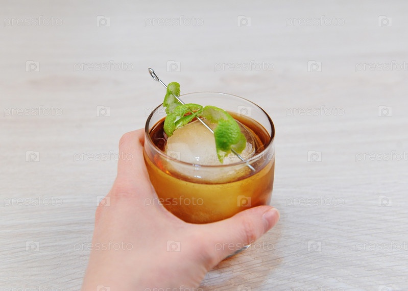 Коктейль виски ром кола с лаймом и целым круглым кусочком льда. В руке на светлой деревянной поверхности