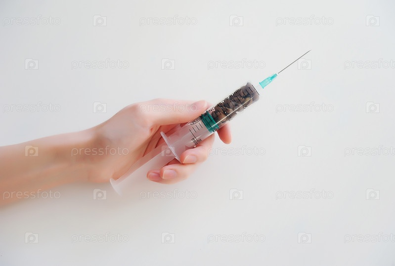 Кофейные зерна в медицинском шприце в руке. Символ зависимости от кофеина. Концепция медицины и здравоохранения