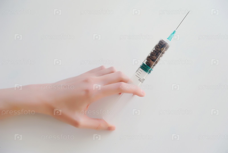 Кофейные зерна в медицинском шприце в руке. Символ зависимости от кофеина. Концепция медицины и здравоохранения