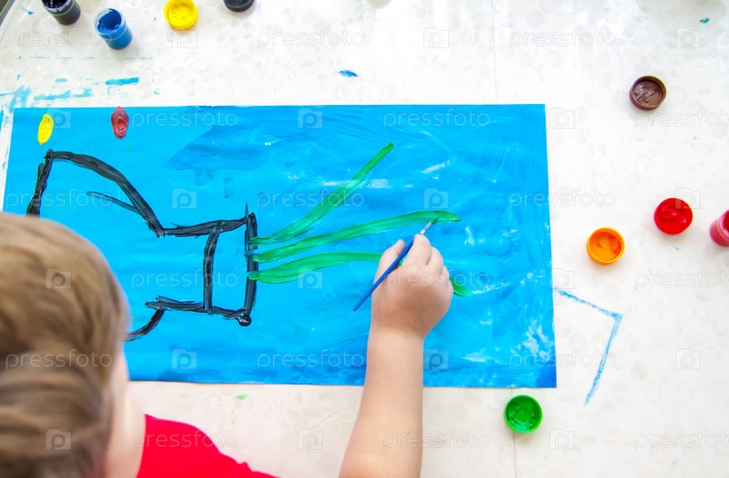 Ребенок рисует яркую картинку. Большие мазки краски на бумаге